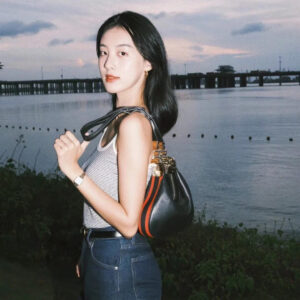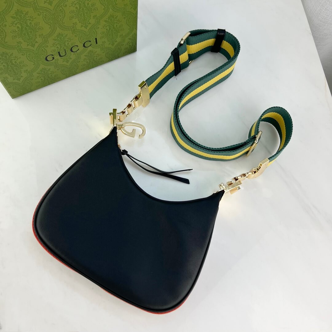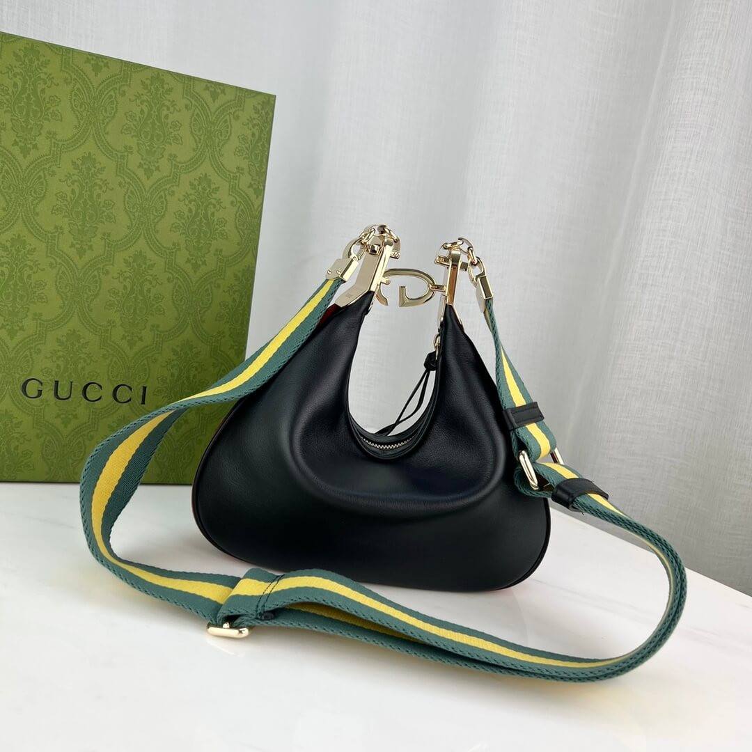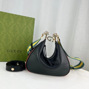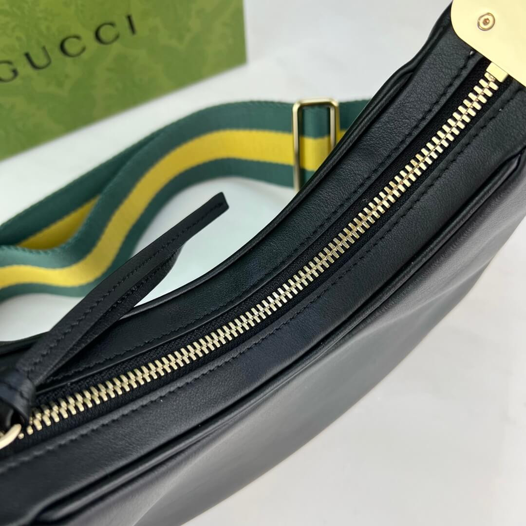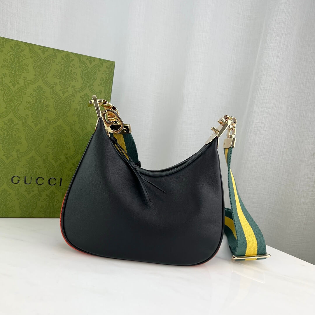 An ode to the timeless Hollywood glamour that shaped Gucci Love Parade, classic elements from the House’s archives are reintroduced. Distinguished by its crescent moon shape, the accessory is further defined by a G shaped hook closure. Paired with soft materials, the heritage hardware creates a refined design with vintage appeal. This small version is crafted in black leather with orange and black Web trim.