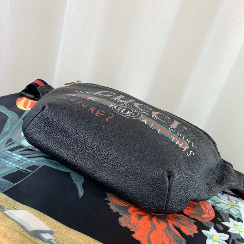 Inspired by vintage prints from the eighties. the Gucci logo is brought to the forefront. The retro-style motif is presented on the front of a belt bag in supple. textured leather.