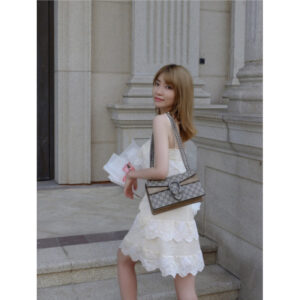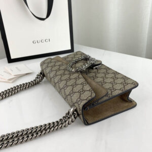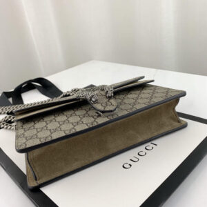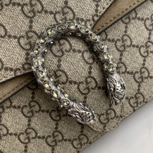 The small Dionysus shoulder bag is presented in the signature GG pattern. trimmed with red suede details. The shape is defined by the defining tiger head closure??a unique detail referencing the Greek god Dionysus. who in myth is said to have crossed the river Tigris on a tiger sent to him by Zeus??further enhanced with sparkling crystals. The sliding chain strap can be worn multiple ways. changing between a shoulder and a top handle bag.