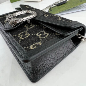 Reminiscent of an archival symbol, the textured tiger head spur is the Dionysus’ defining feature. The feline appearsthroughout the universe, expressing the House’s fascination with the wild beauty of the natural world. Here, the antique silver-toned hardware is paired with a black and ivory GG denim jacquard.
