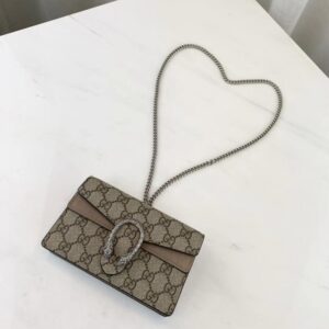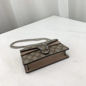 A structured GG Supreme canvas chain super mini bag with a key ring that can be used to attach this bag to a separate larger bag. The closure has the textured tiger head spur closure-a unique detail referencing the Greek god Dionysus. who in myth is said to have crossed the river Tigris on a tiger sent to him by Zeus.