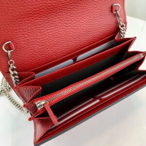 A structured leather chain mini bag or wallet with textured tiger head spur closure-a unique detail referencing the Greek god Dionysus. who in myth is said to have crossed the river Tigris on a tiger sent to him by Zeus. The tiger head closure is enriched with Swarovski crystal stones. Made in resistant textured leather.