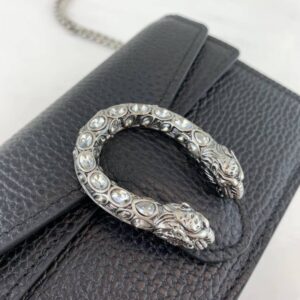 A structured leather chain super mini bag with a key ring that can be used to attach this bag to a separate larger bag. The closure has the textured tiger head spur closure-a unique detail referencing the Greek god Dionysus. who in myth is said to have crossed the river Tigris on a tiger sent to him by Zeus. The tiger head closure is enriched with Swarovski crystal stones. Made in resistant textured leather.