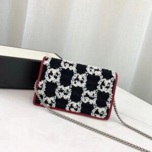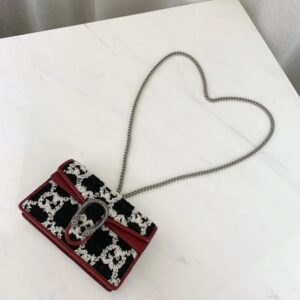 A structured super mini bag trimmed with bright. cerise colored leather. First used in the 1970s. the GG logo was an evolution of the original Gucci rhombi design from the 1930s. Combining House codes in unexpected ways. here the monogram motif is presented on a textured tweed fabric created from three-dimensional yarn in contrasting black and white tones. The petite shape is completed by the tiger head closure. a detail now synonymous with the Dionysus line.
