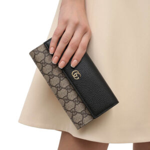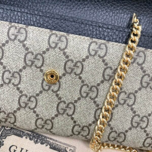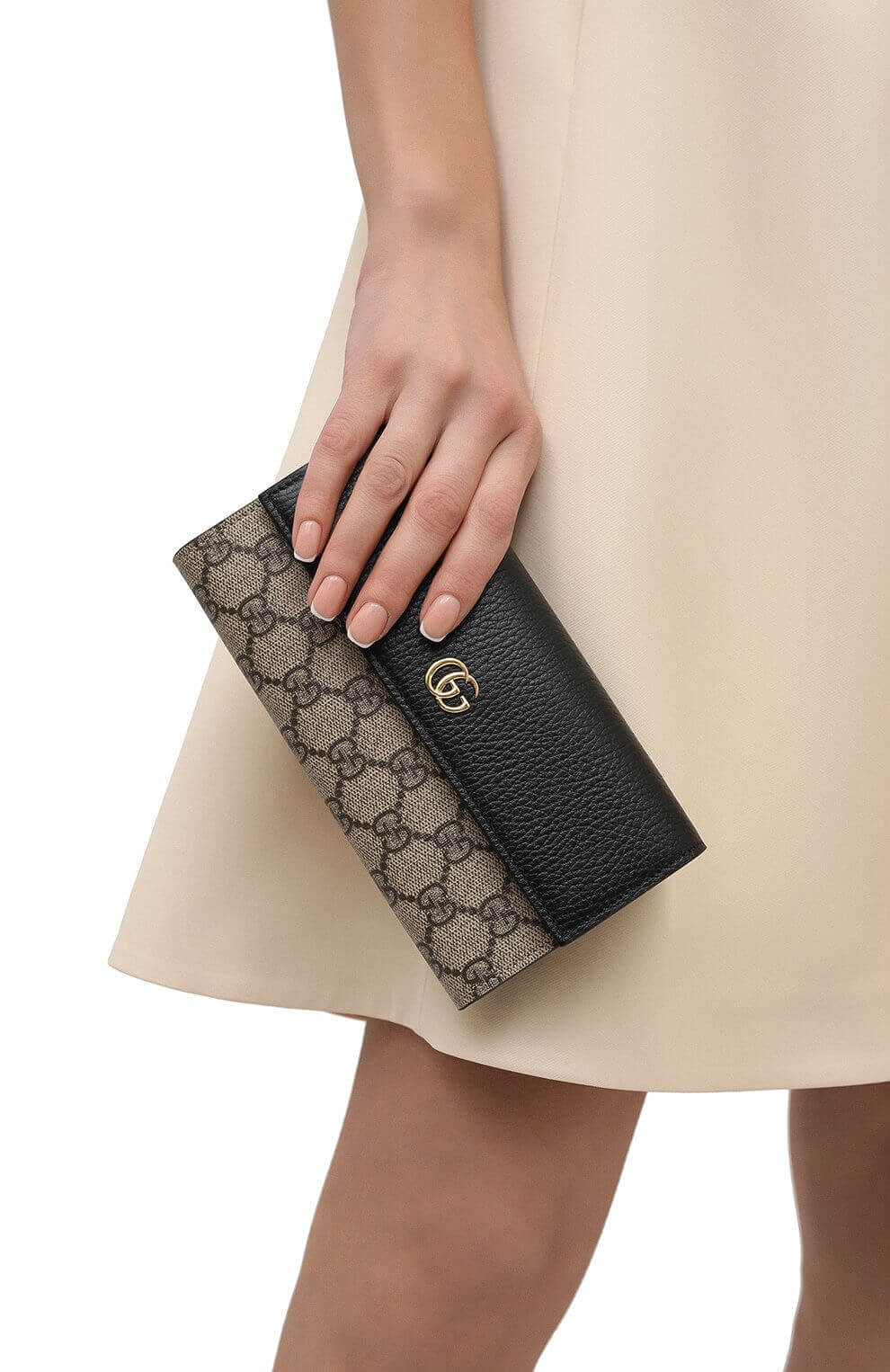 A slim wallet crafted from a mix of the House’s monogram canvas and smooth black leather and completed by a delicate chain strap. A part of the GG Marmont line, the style is defined by a mini version of the emblematic Double G hardware.