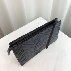This clutch bag is crafted of lovely calfskin leather in black. This bag features chevron stitching with a stitched heart and an interlocking GG logo in aged gold. The top zipper opens to beige interior with a flat pocket. This clutch is perfect for anytime of the day;