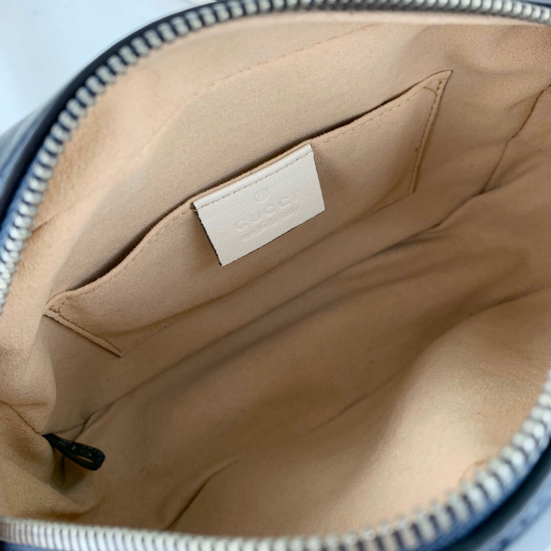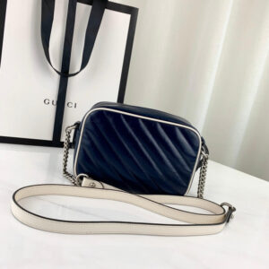 The mini GG Marmont chain shoulder bag has a softly structured shape and a zip top closure with Double G hardware. The chain shoulder strap has a leather shoulder detail. Made in matelasse leather with a chevron design and GG on the back.
