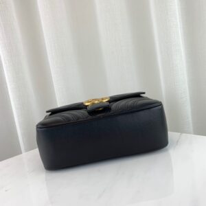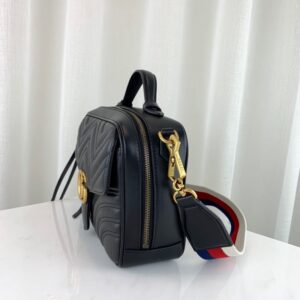 The GG Marmont shoulder bag has a softly structured shape with zip around closure and an oversized front flap with Double G hardware. The shoulder strap features the Sylvie Web stripe. an evolution of the Gucci Web in blue. red and white. Made in matelasse chevron leather with a heart on the back.
