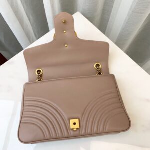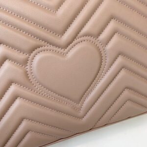 The medium GG Marmont chain shoulder bag has a softly structured shape and an oversized flap closure with Double G hardware. The sliding chain strap can be worn multiple ways. changing between a shoulder and a top handle bag. Made in matelasse chevron leather with a heart on the back.