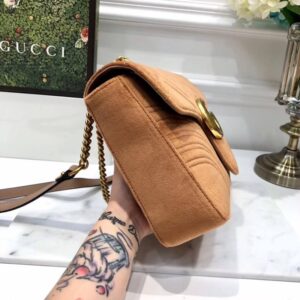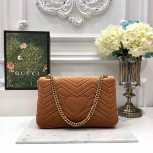 The medium GG Marmont chain shoulder bag has a softly structured shape and an oversized flap closure with Double G hardware. The sliding chain strap can be worn multiple ways. changing between a shoulder and a top handle bag. Made in matelasse chevron leather with a heart on the back.