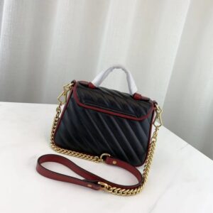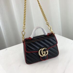 The GG Marmont bag is reimagined for Pre-Fall 2019. made from black diagonal matelasse quilted leather and completed with a twisted torchon Double G embellishment. The mini top handle’s distinct softly structured shape is outlined in contrast cerise piping. highlighting its oversized flap closure. A removable chain strap allows the satchel shape to also be worn as a shoulder bag.