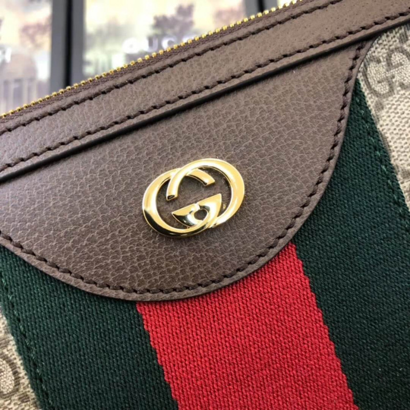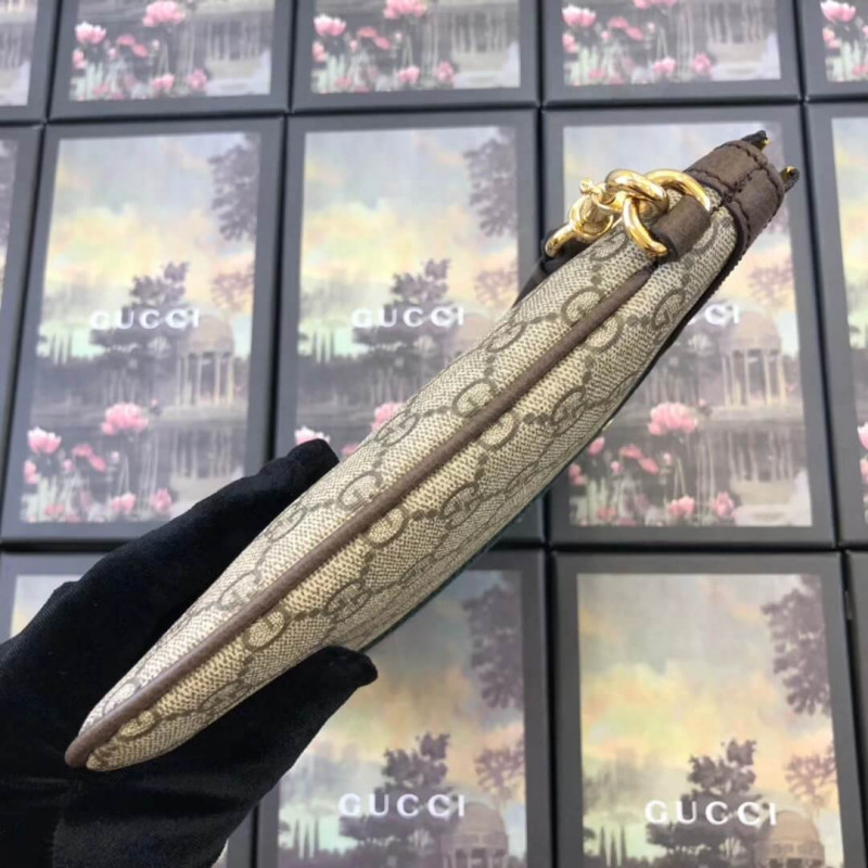This stylish bag is crafted of beige canvas with a signature green and red canvas web stripe. and a gold interlocking GG logo on the front. The pouch features golden brown leather trim. and an optional. matching wristlet strap with gold hardware. The top zipper opens to a pale green fabric interior.