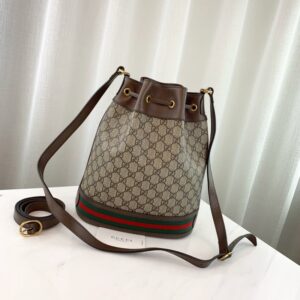 A drawstring shoulder bag with a bucket shape made in soft GG Supreme makes for a multi-functional addition in the world of Ophidia. Trimmed in brown leather. the accessory is defined by the green and red Web stripe inlaid at the bottom. Completed with an extra strap. that can be attached to the original one to emphasize the length. this bag can also be worn across the body.