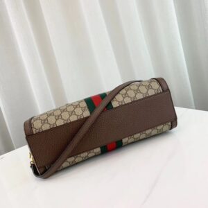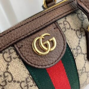 The world of Ophidia evolves with the introduction of a boston bag crafted in GG Supreme canvas with inlaid green and red Web stripe. The accessory is enhanced by a petite play on the Double G. an archival Gucci code from the ’70s that appears atop a leather tab detail and on the zipper pull. The bag is completed with a detachable shoulder strap which allows it to be carried in multiple ways.