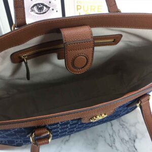 The Gucci Ophidia GG medium tote 631685 is a part of the Ouverture collection and is made in Italy. It features a dark blue and ivory eco washed organic GG jacquard denim with brown leather trim and gold-toned hardware. The cotton linen lining adds to the durability of the bag. The Double G. an archival symbol from the ’70s. completes the vintage inspired style. The tote has a medium size of 15??W x 11??H x 5.5??D and weighs approximately .71kg. It has a magnetic snap closure and double leather handles with a 10?? drop and 21?? length. The interior zipper pocket adds to the functionality of the bag.