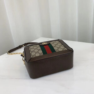 The world of Ophidia continues to evolve with the introduction of new shapes for Cruise 2020. including the mini shoulder bag in GG Supreme canvas. Trimmed with the green and red Web stripe. the style is completed a gold-toned Double G distinctive of the line. A leather top handle and chain shoulder strap lend a multifunctional element to the shape.