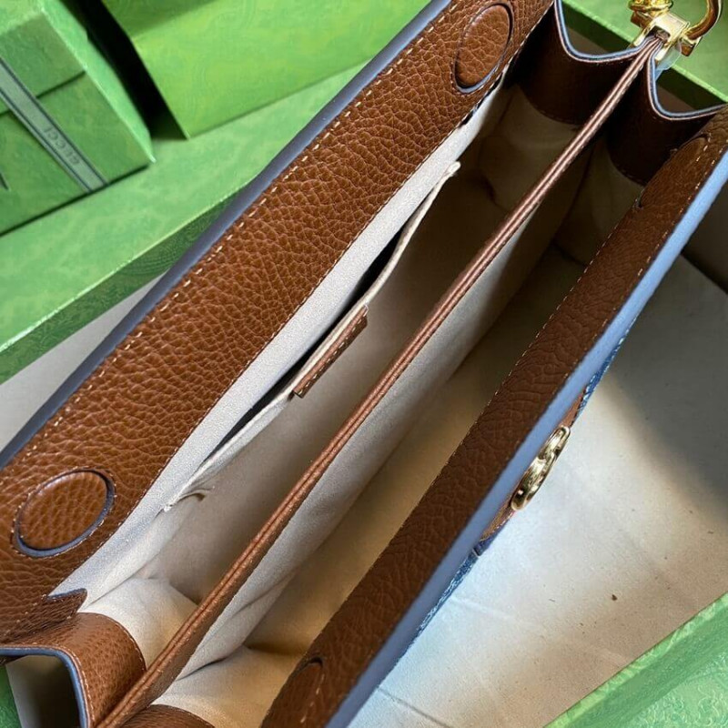 The Gucci Ophidia GG Small Shoulder Bag 503877 in Blue Denim is a vintage-inspired chain strap shoulder bag that is crafted in GG Supreme canvas with inlaid Web stripe detail. The bag has a structured shape that secures with a magnetic closure. which is trimmed with leather and Double G hardware??an archival detail. The bag measures 26 x 17.5 x 8 cm and is made of beige/ebony GG Supreme canvas. a material with low environmental impact. with brown leather trim. It features blue and red Web. gold-toned hardware. hand-painted edges. double gussets. and an interior open pocket. The chain shoulder strap has a 17″ drop. and the bag has a silk lining. The bag’s size is 10 W x 7 H x 3 D.