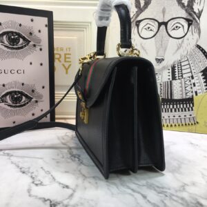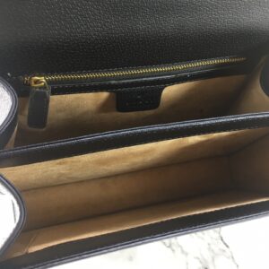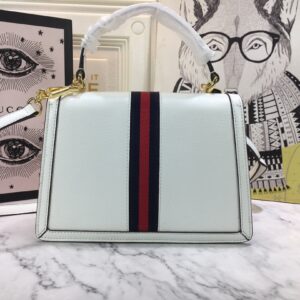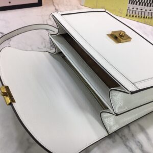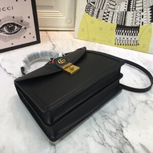 The Gucci Ophidia small top handle bag with Web Black/White is a stylish and environmentally conscious accessory. Made from black and white leather with shiny gold-toned hardware. the bag features the iconic green and red House Web stripe and Double G hardware. The microfiber lining has a suede-like finish and the inserts are made from leather that has been tanned using an alternative metal or chrome-free process. reducing the environmental footprint. The bag has a magnetic closure and includes an internal zip pocket and open pocket. It can fit a cell phone up to W78mm x H167mm x D9mm and has a handle with a 10cm drop and a detachable shoulder strap with a 48.5cm drop. The small size of the bag is W25cm x H17.5cm x D7cm and it weighs approximately .7kg. This top handle bag is part of the Epilogue collection and has a vintage-inspired square shape that is accentuated by the House Web stripe and Double G hardware. Crafted from the House’s monogram canvas. the style has a strong logo feel.