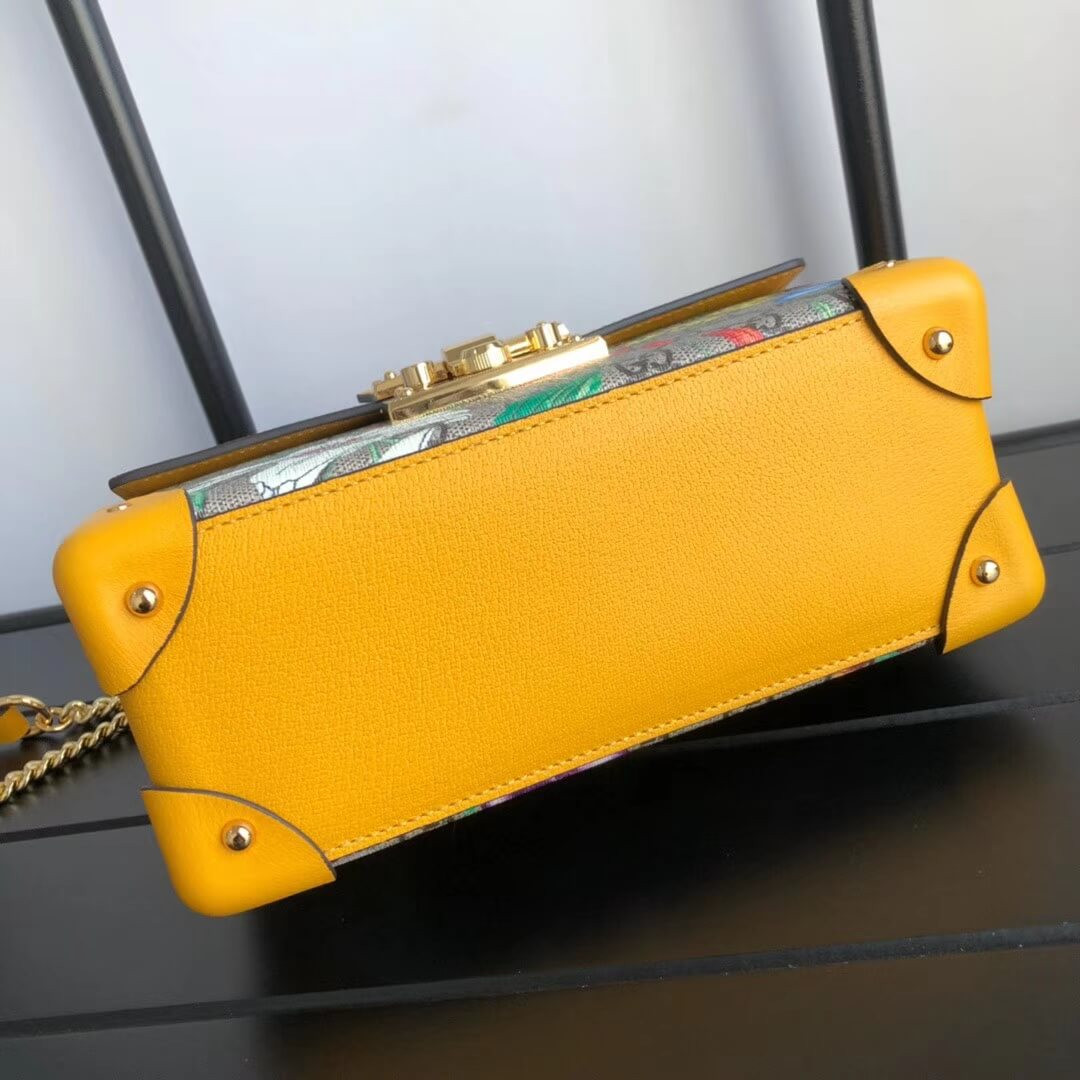 A special collection combines two of the House’s most distinctive designs into an unexpected and contemporary fabric, animating classic silhouettes like the Padlock bamboo top handle shoulder bag. The historic Flora motif, first presented by Vittorio Accornero more than 50 years ago, is layered over the House monogram and trimmed with bright yellow leather for a modern take on the two archival patterns.