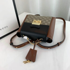 The structured backpack features defining details from the Padlock collection. in GG Supreme canvas with black and brown leather trims. The chain top handle is distinctive to the line. along with the key lock closure pulled straight from the archives. The key is placed in a detachable leather key case.