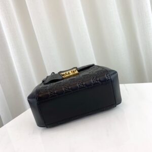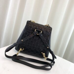 The structured backpack features defining details from the Padlock collection. The chain top handle is distinctive to the line. along with the key lock closure pulled straight from the archives. The key is placed in a detachable leather key case. Made in heat debossed Gucci Signature leather with a defined print and firm texture.