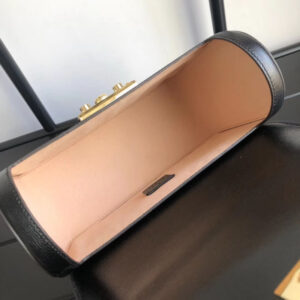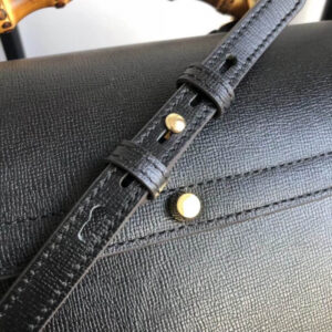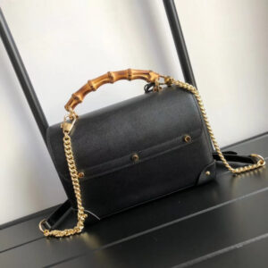 Archival details. including the bamboo handle and closure. combine in a modern silhouette in the small shoulder bag. crafted from textured black leather. The structured shape has a flap closure that locks with a key kept in a removable leather holder. The top handle shape is further enriched with a removable chain and leather shoulder strap.