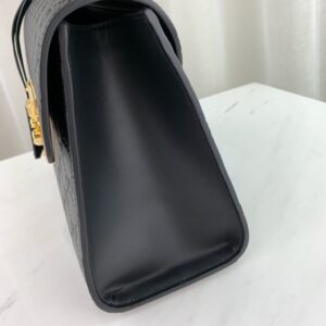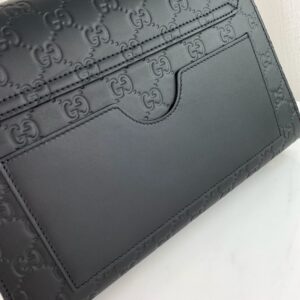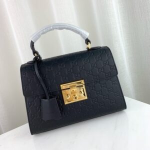 A small structured top handle bag with a key lock closure pulled straight from the archives. the key is placed in a leather key case. The shoulder strap is attached to the top handle for a simpler look that echoes a briefcase. Made in heat debossed Gucci Signature leather with a defined print and firm texture.
