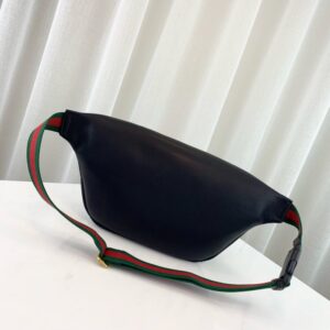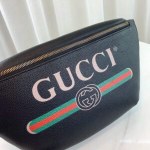 Inspired by vintage prints from the eighties. the Gucci logo is brought to the forefront. The retro-style motif is presented on the front of a belt bag in supple. textured leather.
