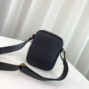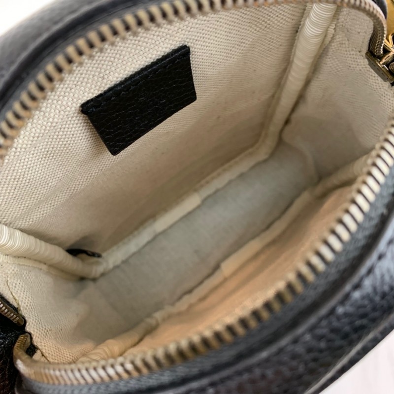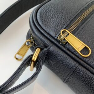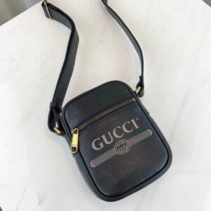 A down-sized version of the messenger bag introduced in Pre-Fall 2018. the leather shoulder bag is crafted from textured black leather printed with the Gucci logo. The distinctive trademark appears on the front of the bag??an eighties inspired motif that encompasses the House name with the Web and Interlocking G. An adjustable leather shoulder strap. front pocket and zipper closure complete the style.
