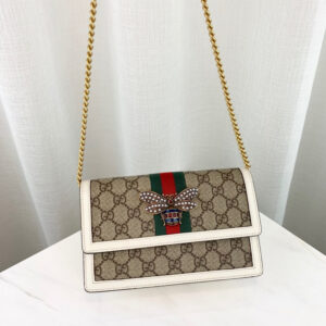 An eclectic mixture of historical Gucci details and newly established codes. the Queen Margaret line evolves with the introduction of a mini bag. Presented in GG canvas. a versatile fabric that continues to pay homage to the House’s roots. the accessory is enriched by a metal bee adorned with glass pearls and multicolour crystals??a precious play on an archival symbol from the ’70s.