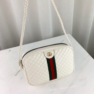 The small leather shoulder bag in quilted leather mixes a sportswear feel with distinctive emblems of the House. The shiny leather is contrasted with the traditional green and red Web stripe and Double G hardware.