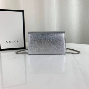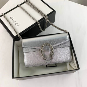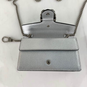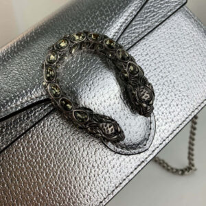 The structured super mini bag is introduced in metallic silver leather. with a key ring that can be used to attach the bag to a separate larger bag. The closure features the textured tiger head spur??the unique detail defines the line. referencing the Greek god Dionysus. who in myth is said to have crossed the river Tigris on a tiger sent to him by Zeus.