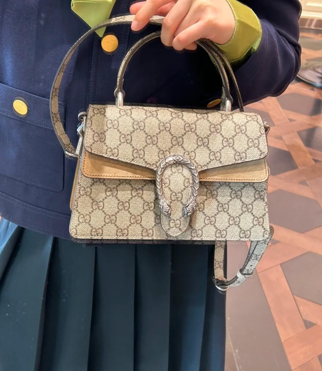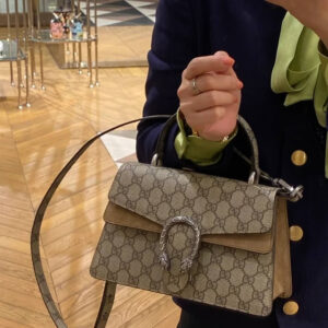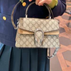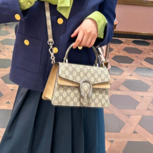 A structured GG Supreme canvas top handle bag appears beige and ebony with subtle taupe suede trim. The textured tiger head closure defines the front as a unique hardware detail.