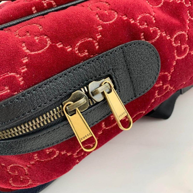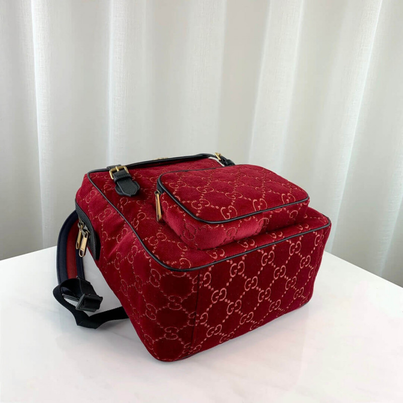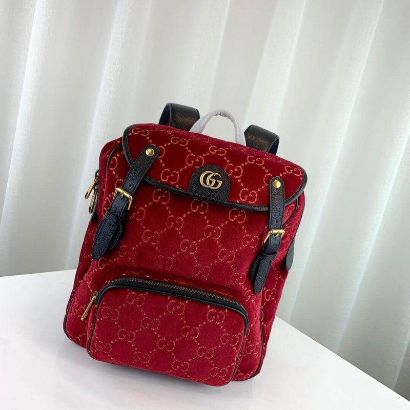 The backpack is presented in a smaller silhouette for Pre-Fall 2019. in dark blue GG velvet with leather trims. The distinctive GG motif is embedded into the soft velvet fabric. contrasted by black leather buckles. trims and gold-toned hardware. The padded leather straps feature a hidden House detail. with the blue and red stripe at the interior.