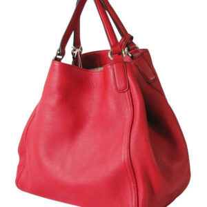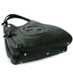 | Exterior | Dark black calfskin leather exterior with top sides turning in to attach in the center to a hook clasp closure,a large heat embossed Gucci logo in front highlighted with stitch embroidery,two flat leather arm-carry straps attached to tiny brass buckles and a leather tassle suspended from one of the strap buckles |