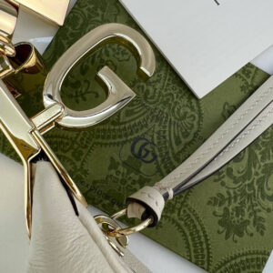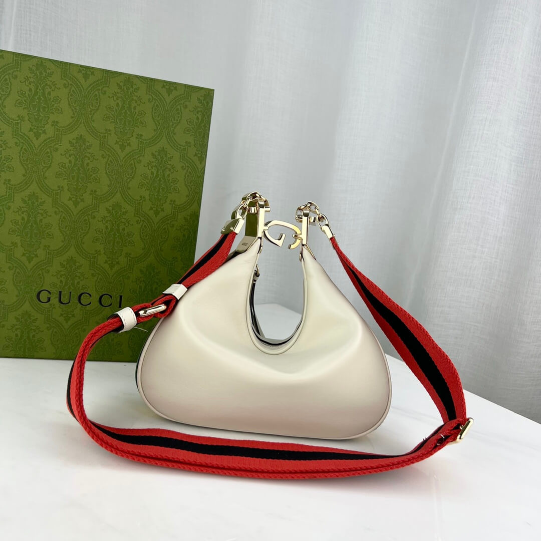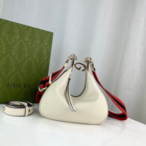 An ode to the timeless Hollywood glamour that shaped Gucci Love Parade, classic elements from the House’s archives are reintroduced. Distinguished by its crescent moon shape, the accessory is further defined by a G shaped hook closure. Paired with soft materials, the heritage hardware creates a refined design with vintage appeal. This small version is crafted in black leather with orange and black Web trim.