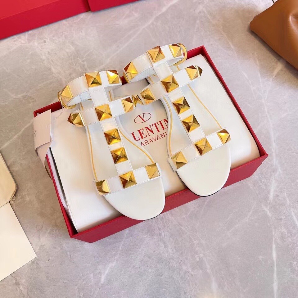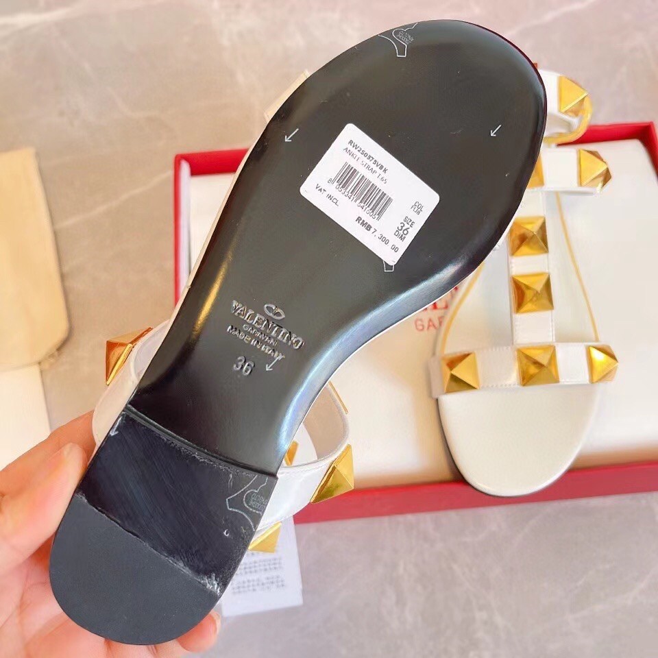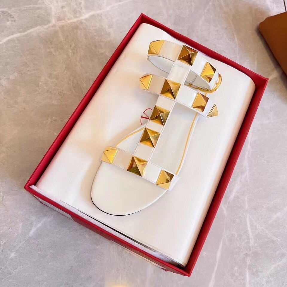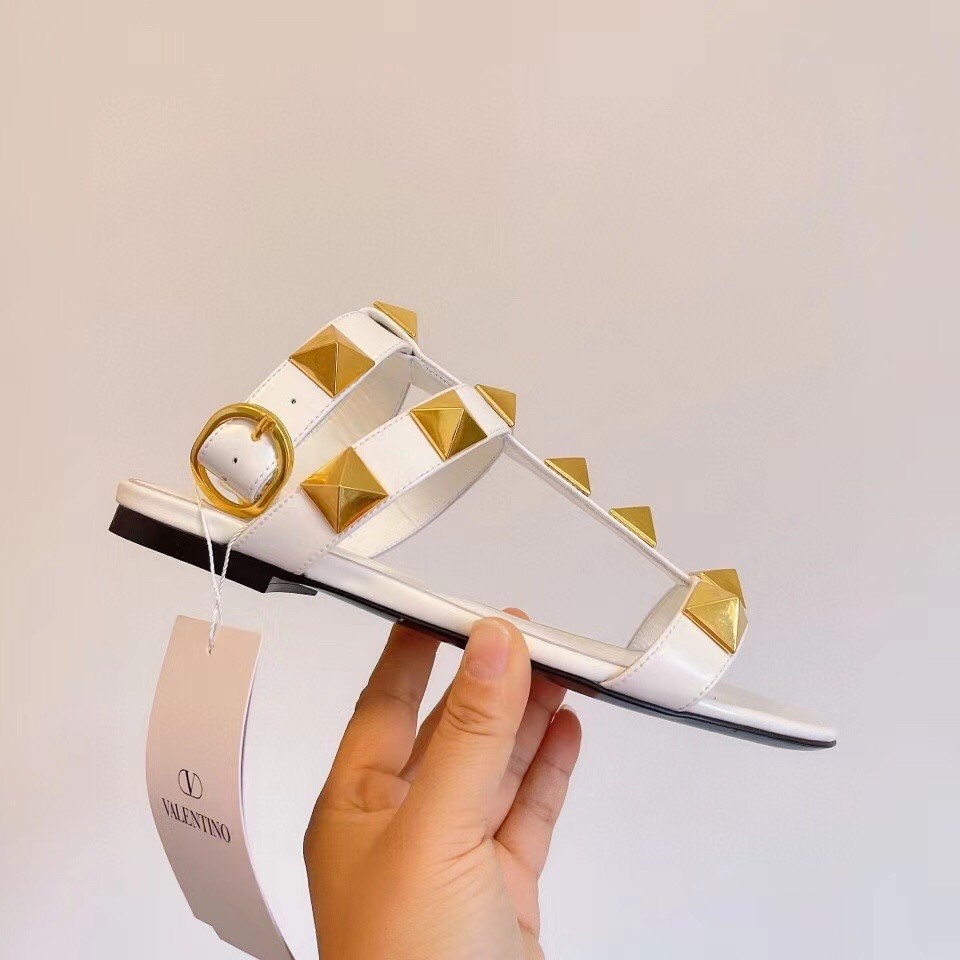 Valentino Roman Stud Flat Sandals In White Calfskin