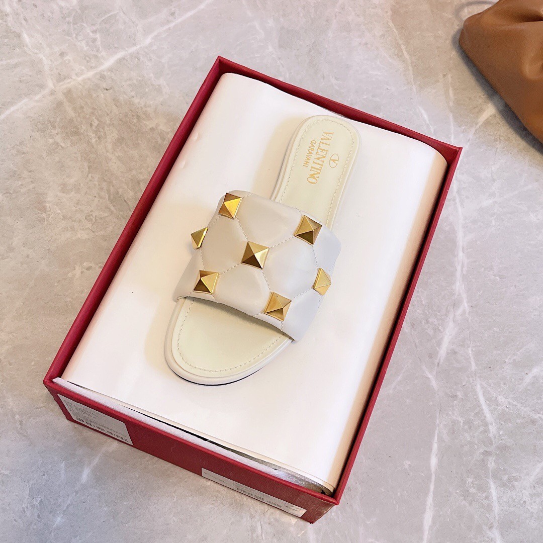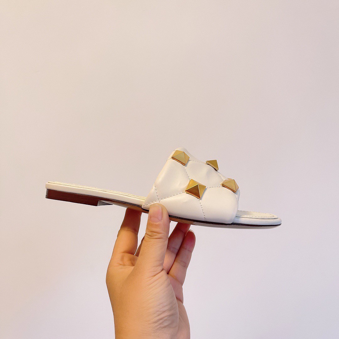 Valentino Roman Stud Flat Slides In White Quilted Nappa