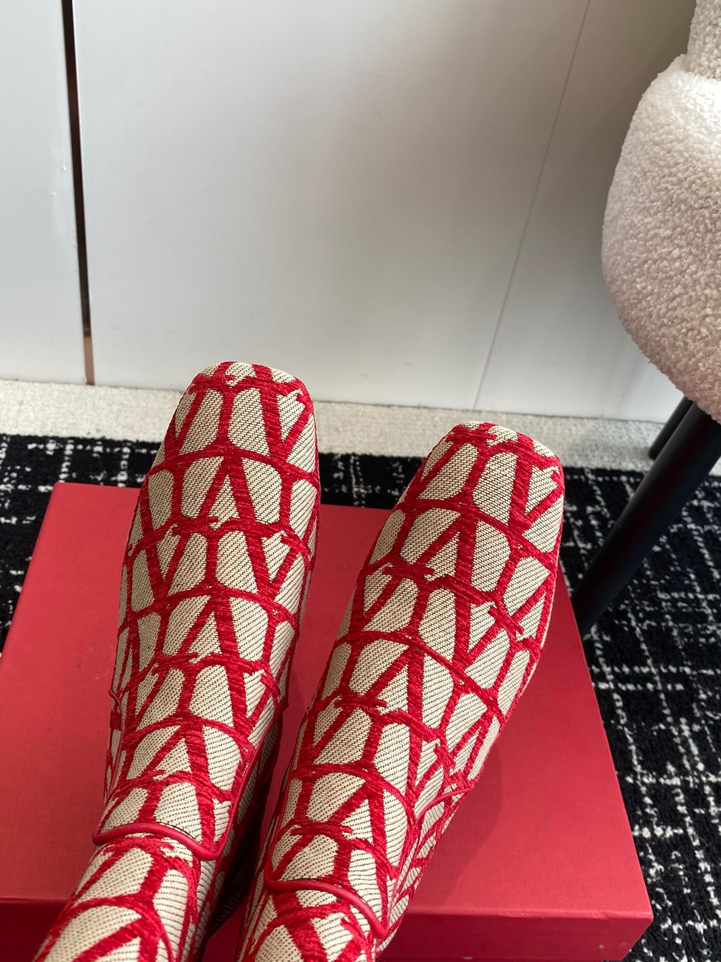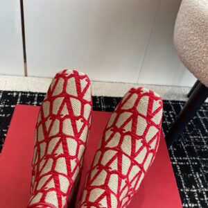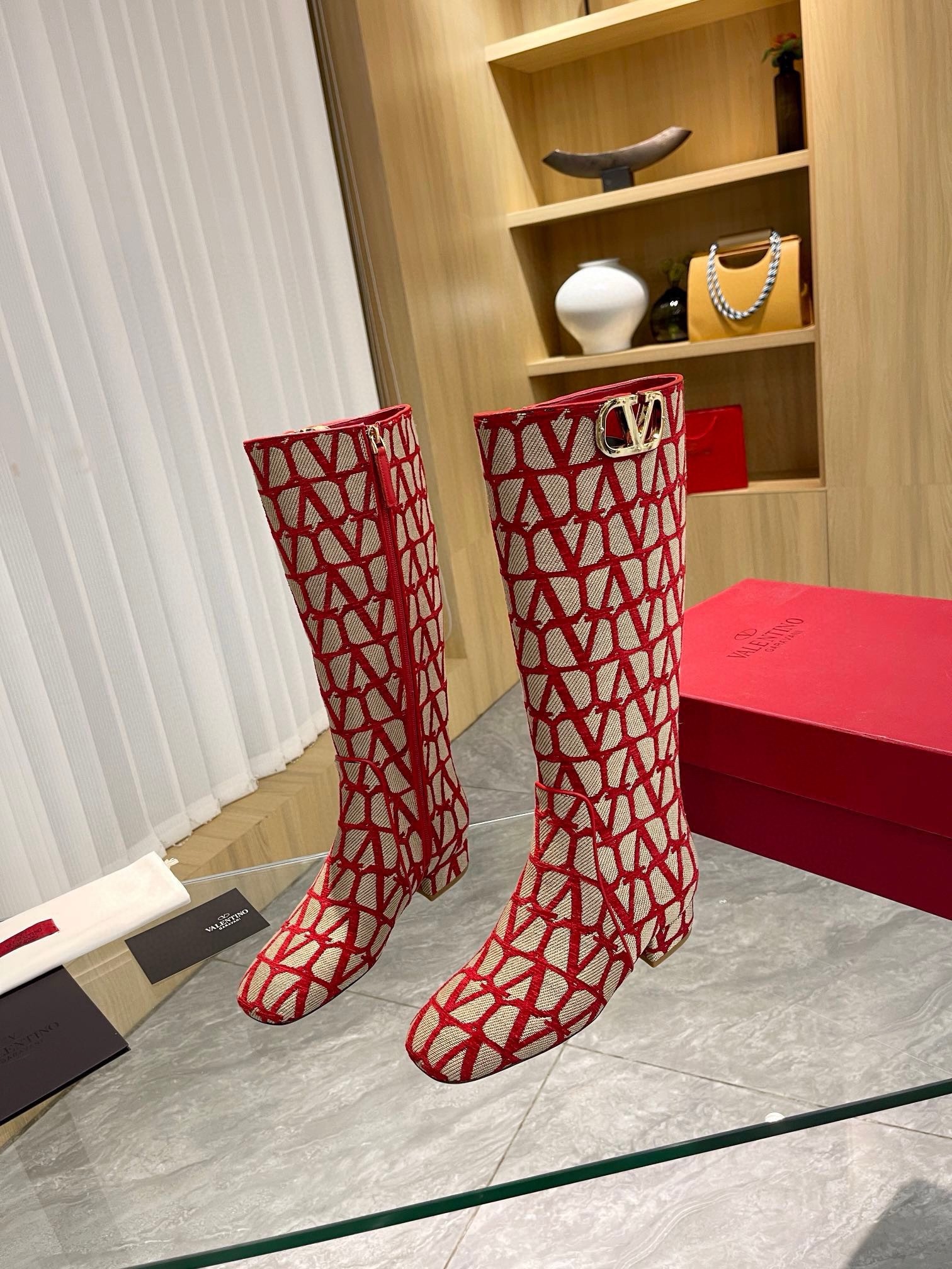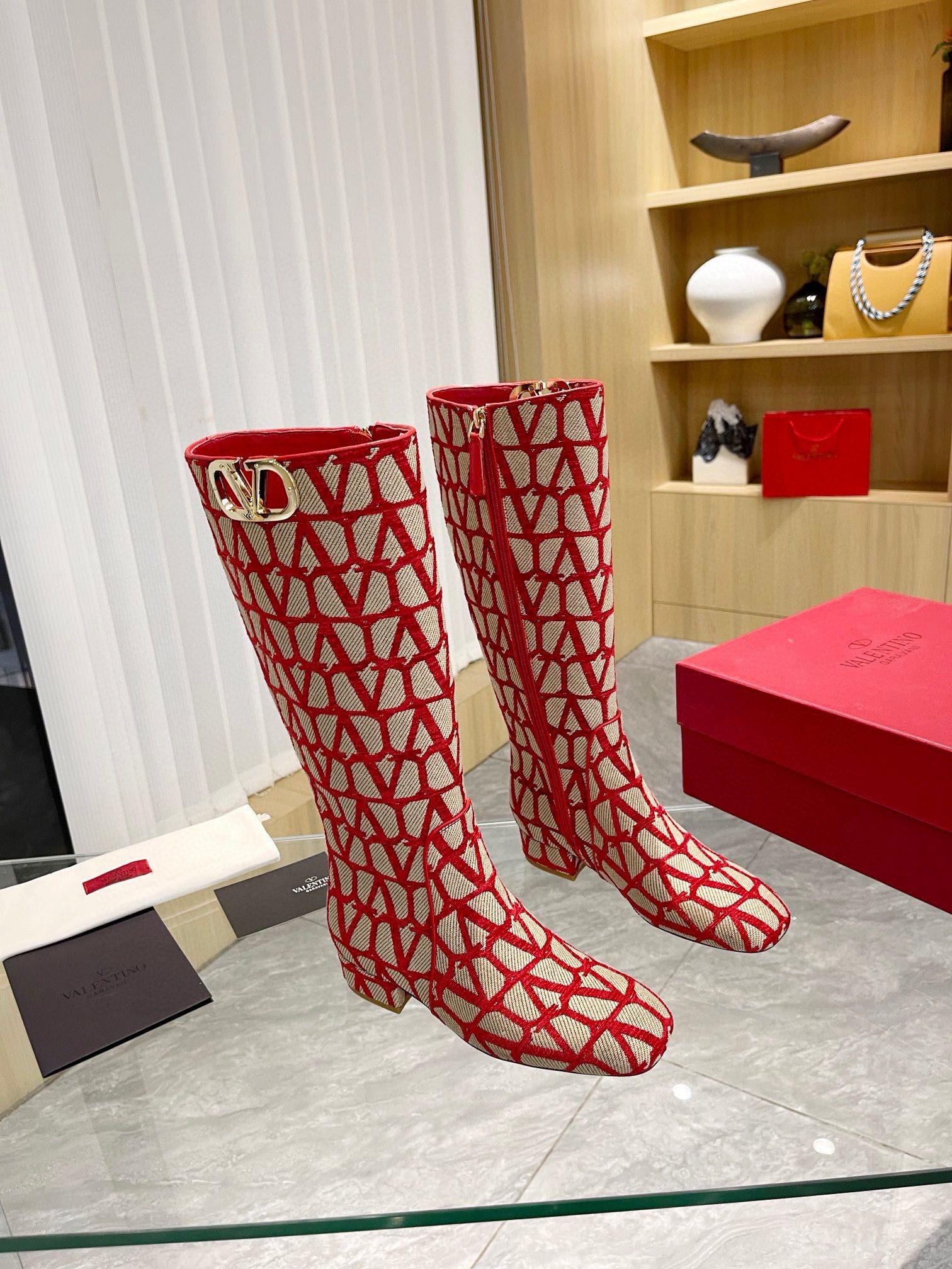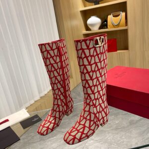 Valentino VLogo Type Knee Boots in Red Toile Iconographe fabric