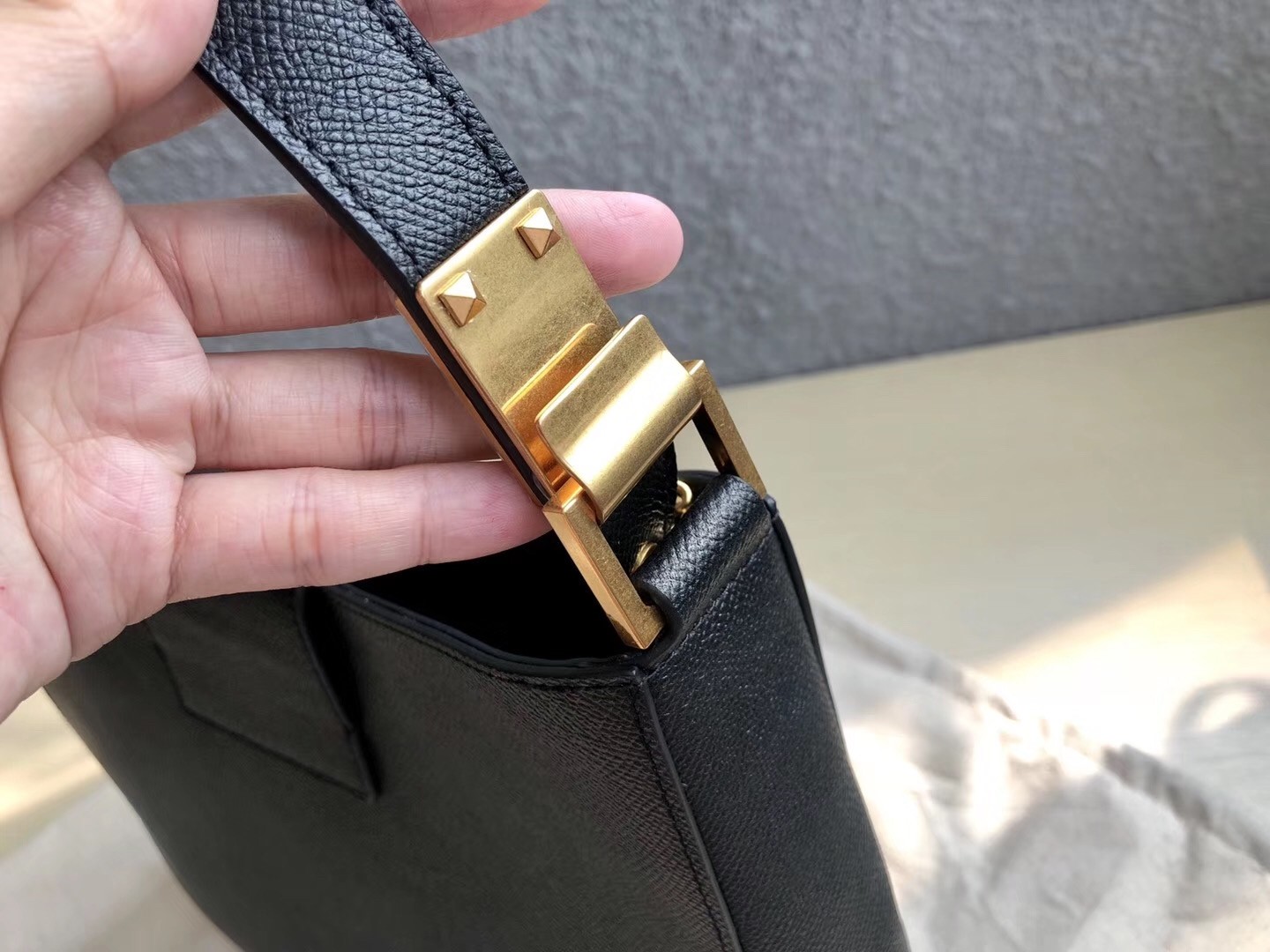 – Leather shoulder strap with adjustable chain