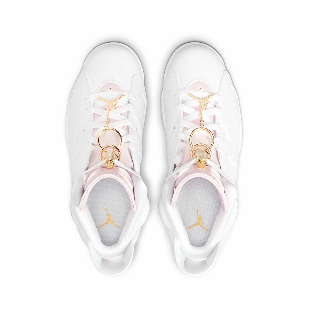 The women’s Air Jordan 6 Retro ‘Gold Hoops’ adds gilded accents to the shoe that Michael Jordan wore when he clinched his first ever NBA championship. The vintage mid-top carries a white tumbled leather upper with Barely Rose hits on the tongue, heel tab and midsole, fitted with a visible Air-sole unit in the heel. Metallic gold lace locks are matched by a trio of earring-inspired gold hoops, with a Jumpman charm attached to the lowest ring via a short gold chain. Underfoot, milky translucent rubber is utilized on the outsole.